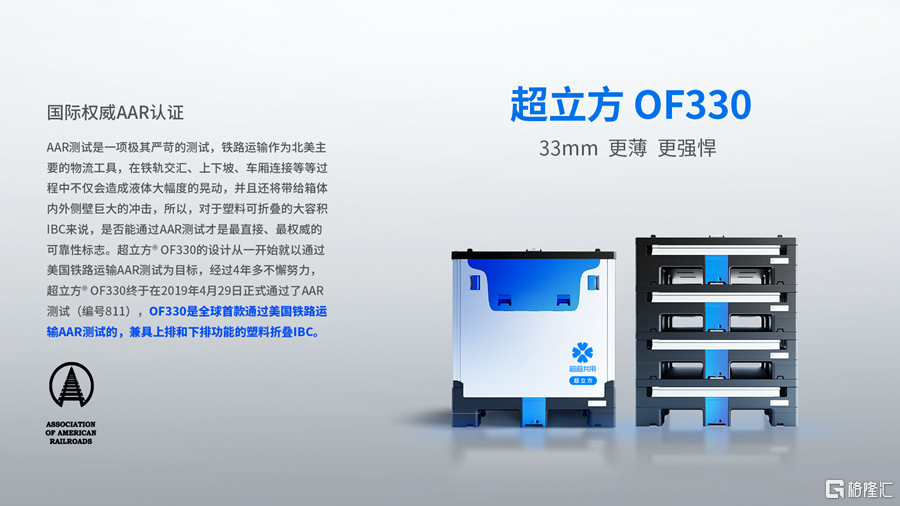箱箱共用,如何成爲中國工業智能循環包裝界的龍頭?其旗下超立方®OF330是全球首個通過物流箱領域“魔鬼測試”(美國鐵路運輸AAR測試)的IBC(中型散裝容器)就是其工程化能力的有力驗證,配合其部署全國的百網千驛循環服務網絡,實現了近100萬各類智能循環箱資產的運營和服務。