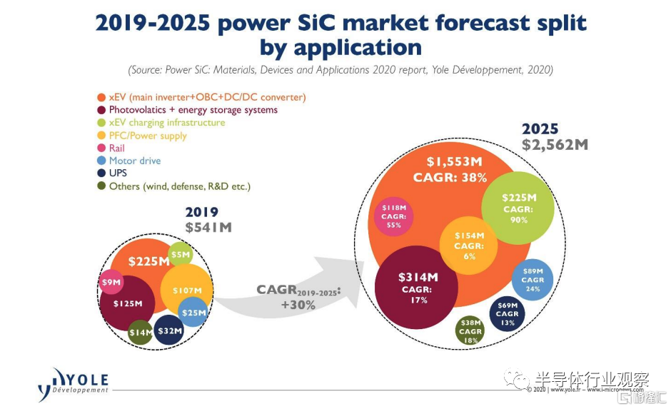 據Yole統計預測,自2001年碳化硅器件首次商用以來,這個新興器件在過去多年已經獲得了市場的證明。而整個SiC器件市場在2019年至2025年間將以30%的CAGR增長,截至2025年應達到25億美元以上。按照Yole的說法,作爲整個功率電子市場的主要驅動因素之一,汽車應用有望在SiC功率半導體領域也成爲主要市場之一。