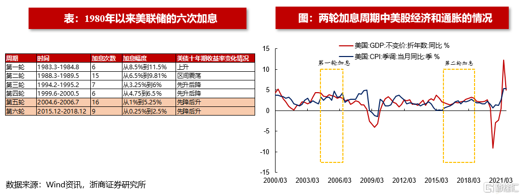 2000年以來美國兩輪加息週期,原因各不相同。(1)2004年-2006年這輪加息週期中,通脹壓力是導致美聯儲收緊貨幣政策的核心原因。2003年下半年經濟強勁復甦,需求快速上升拉動通脹擡頭,房地產泡沫也初步開始顯現。2004年美聯儲開始收緊貨幣政策,隨後美國的經濟增長回落但通脹壓力依舊居高不下。(2)2015年-2018年這輪加息週期中,防止經濟過熱是導致美聯儲收緊貨幣政策的核心原因。美國爲應對2008年發生的金融危機,推出了3輪量化寬鬆,聯邦基金利率長期保持在接近於0的水平。但是從2013年開始,美國經濟強勁復甦逐步擺脫危機的陰影,貨幣政策也開始重回正軌防止經濟出現過熱現象。
