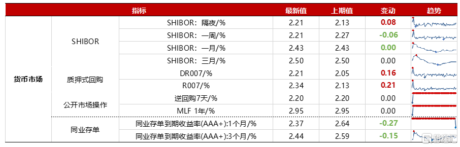 上週SHIBOR隔夜/一週/一月利率分別爲2.21%(+0.08%)、2.21%(-0.06%)、2.43%(-0%)。