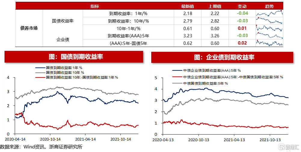 上週國債期限利差擴大。上週國債1年到期收益率爲2.2%(-0.04%),10年到期收益率爲2.8% (-0.03%)。