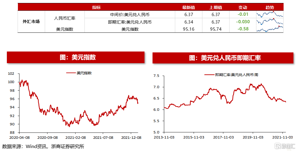上週美元指數下降,人民幣對美元升值。上週美元指數爲95.16(-0.6)。美元兌人民幣即期匯率爲6.34 (-0.03)。