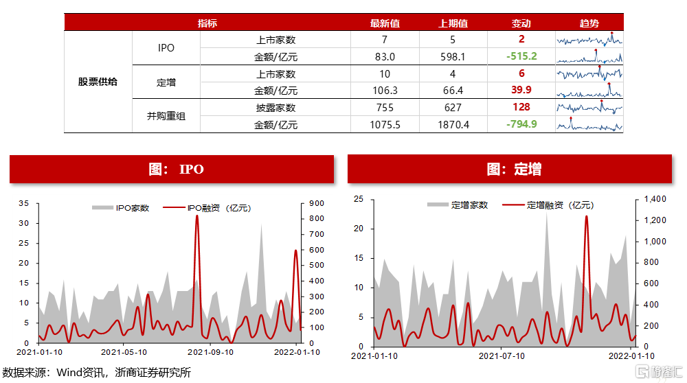 上週IPO上市家數增加,定增家數增加,併購重組家數減少。上週IPO上市有7家(+2家),金額83億 (-515.2億元)。定增有10家(+6家),金額106.3億元(+39.9)億元。併購重組有267家(-488家),金 額673.3億元(-402.2億元)。