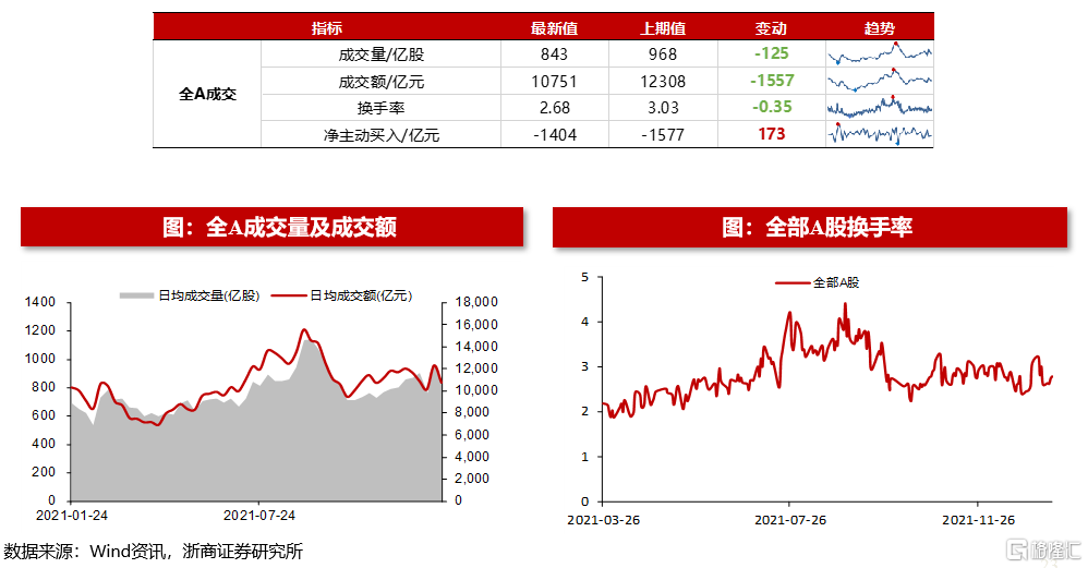 上週全A日均成交額下降。上週全A日均成交量爲843億股(-124.8億股),成交額爲10751.4億元 (-1556.9億元)。