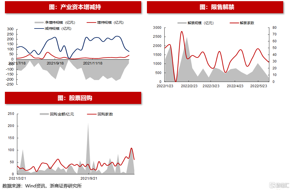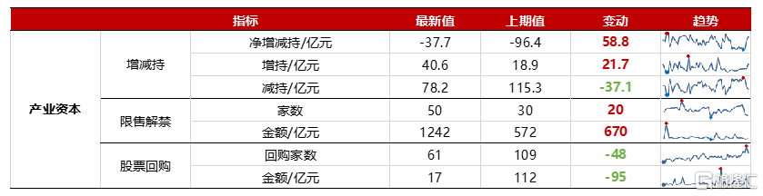 上週產業資本淨減持。上週產業資本增持40.6億元(+21.7億元),減持78.2億元(-37.1億元),淨減持 37.7億元(+58.8億元)。