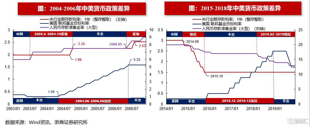 兩輪美聯儲加息,中國並不一定跟隨加息。2004年6月美聯儲開始第一次加息,中國央行在2004年10月開始加息。從政策收緊的時間點來看,中國其實在2003年8月開始上調存款準備金率,已經開始收緊貨幣政策應對經濟過熱風險。在隨後幾次美聯儲加息中,中國的貨幣政策也沒有跟隨。2015年12月到2018年12月美聯儲加息週期中,中國沒有加息也沒有升準,反倒是在2018年初開始降準。