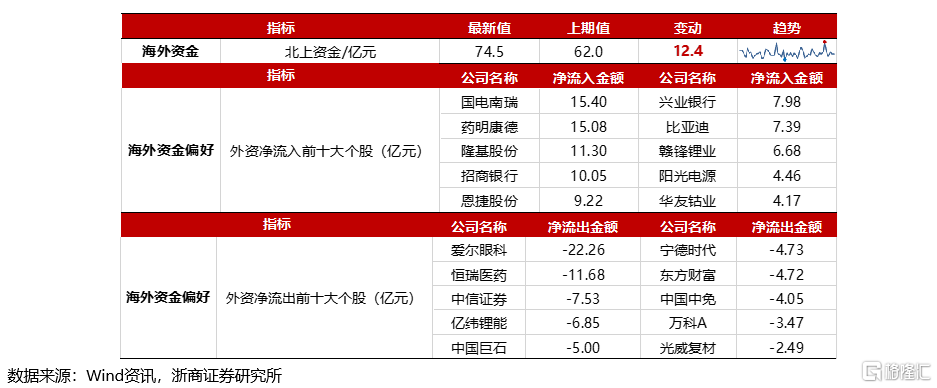 上週北上資金淨流入。上週北上資金淨流入74.5億元,較前一週流入增加12.4億元。