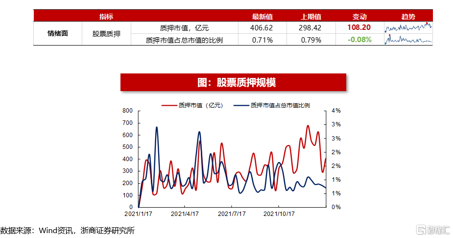 上週股票質押佔總市值的比例下降。上週質押市值爲406.6億元(+108.2億元),質押市值佔總市值的比例 爲0.71%(-0.08%)。