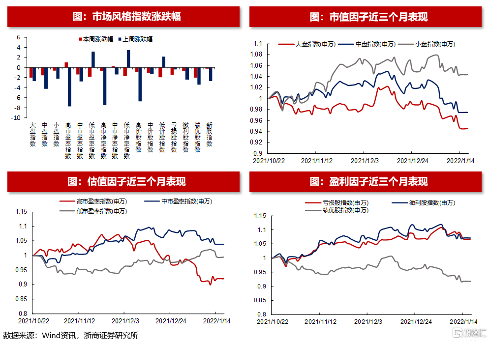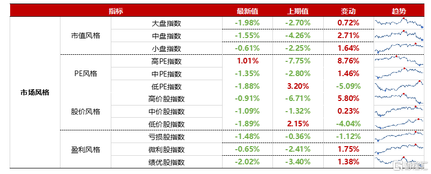 上週小盤指數、高PE指數、高價股指數、微利股指數表現相對佔優。上週市值風格中,大盤/中盤/小盤指數 漲跌幅分別爲-1.98%、-1.55%、-0.61%。PE風格中,高PE/中PE/低PE指數漲跌幅分別爲-0.91%、-2.8%、 3.2%。股價風格中,高價股/中價股/低價股指數的漲跌幅分別爲-6.71%、-1.09%、-1.89%。盈利風格中,虧損股/微利股/績優股指數的漲跌幅分別爲-1.48%、-0.65%、-2.02%。