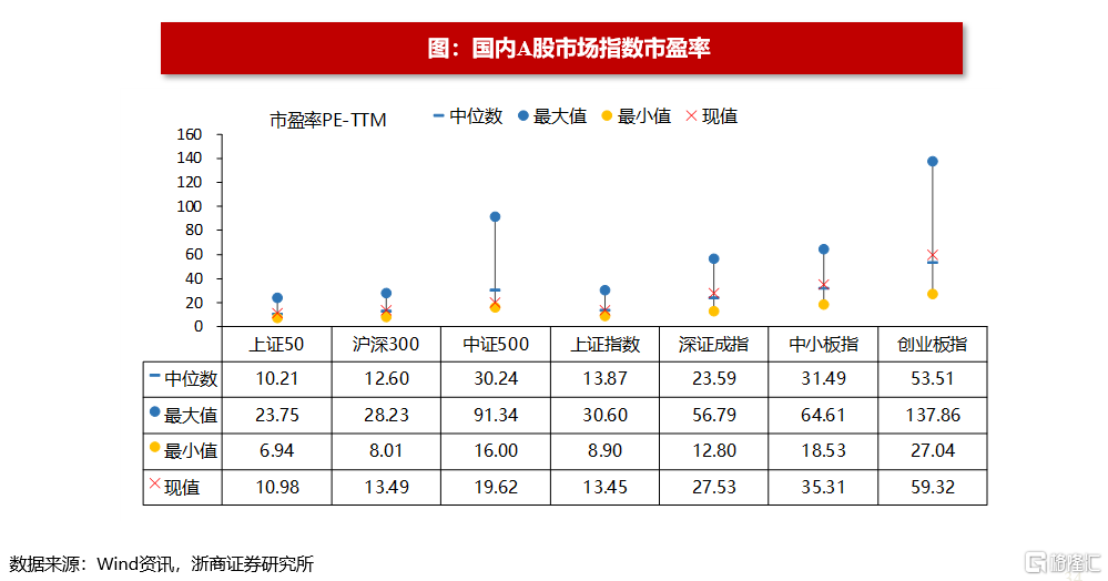 上週上證50、滬深300、中證500、上證指數、深圳成指、中小板指、創業板指的市盈率分別爲10.98、13.49 、19.62、13.45、27.53、35.31、59.32。過去十年分位數分別爲74.1%、72.3%、3.8%、50.1%、61.6%、 81%、73.2%。