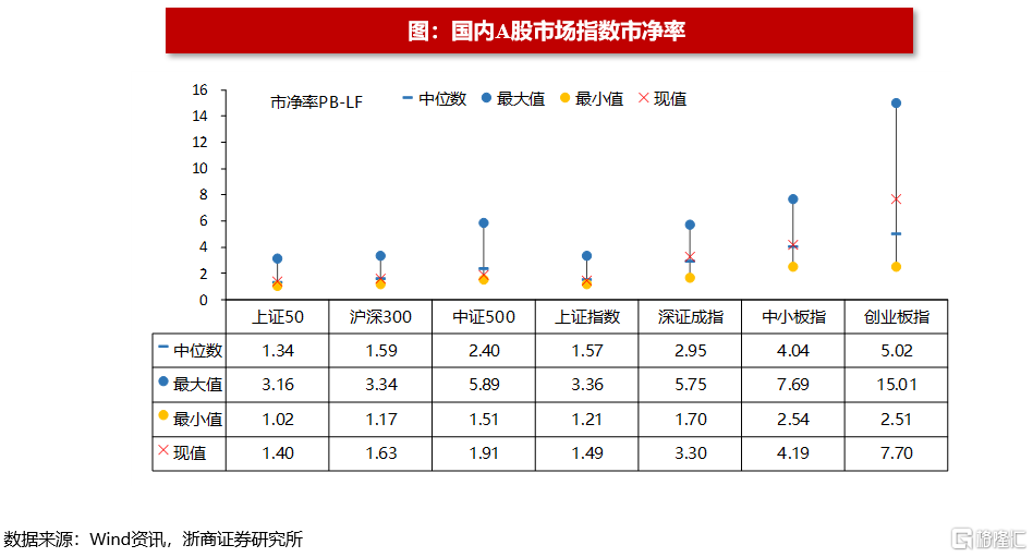 上週上證50、滬深300、中證500、上證指數、深圳成指、中小板指、創業板指的市淨率分別爲1.4、1.63、 1.91、1.49、3.3、4.19、7.7。過去十年分位數分別爲66.6%、63.1%、15%、37.6%、76.6%、61.9%、 82.8%。