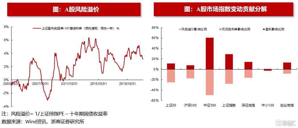 今年以來上證50、滬深300、中證500、上證指數、深圳成指、中小板指、創業板指漲跌幅受盈利影響的比例 分別爲11.23%、7.97%、60.7%、29.08%、14.11%、-2.48%、13.3%,受無風險利率影響的比例分別爲- 0.56%、-0.45%、-0.33%、-0.65%、-0.23%、-0.19%、-0.1%,受風險溢價影響的比例分別爲-24.45%、-16.81%、-49.15%、-27.05%、-16.09%、1.71%、-8.04%。