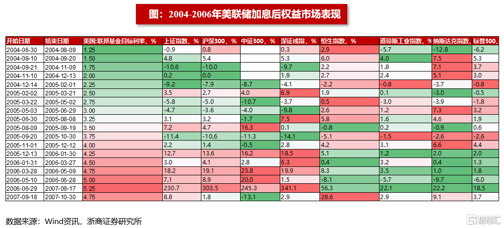 2004-2006年美國“防通脹”加息中,美股受到了較大的影響。2004年6月-2006年7月,美國加息了16次,貨幣政策變化頻繁。按照每次加息後市場的表現來看,美股在第一次加息受到比較大的衝擊,第一次加息中道瓊斯、納斯達克和標普500分別下跌5.7%、12.8%和6.2%。雖然後面的加息對美股影響較小,但從整輪加息週期中美股的上漲是要弱於A股。