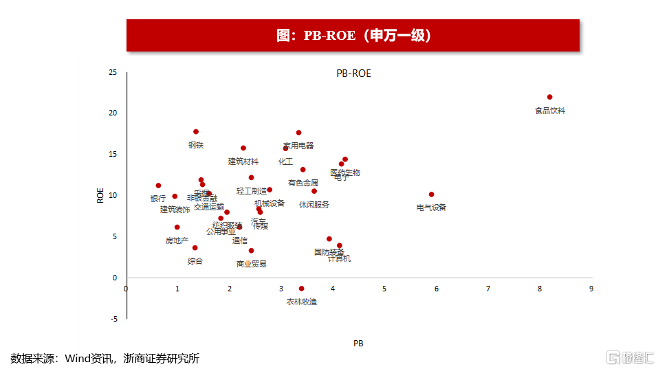 從PB-ROE的角度來看,上週估值水平遠低於盈利能力的行業分別爲銀行、鋼鐵、建築裝飾、採掘、非銀金融 、建築材料、交通運輸、房地產、家用電器、化工。