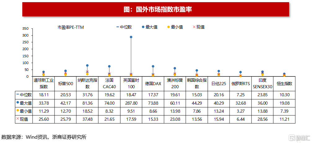 上週道瓊斯工業指數、標普500、納斯達克指數、法國CAC40、英國富時100、德國DAX、澳洲標普200、韓 國綜合指數、日經225、俄羅斯RTS、印度SENSEX30、恆生指數的市盈率分別爲25.6、25.79、37.48、 21.65、17.59、15.33、23.08、13.56、15.94、6.44、28.56、11.21。過去十年分位數分別爲87.3%、84.6% 、71.4%、61.4%、40.1%、27.1%、65.6%、27.7%、10.8%、29.8%、78.2%、71.4%。