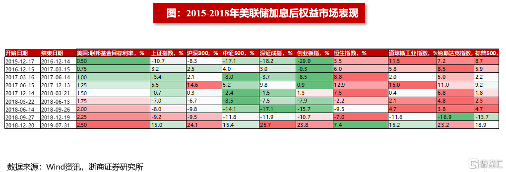 2015-2018年國內權益市場並未受到美國加息的顯著影響。回顧2015年12月至2019年7月A股表現,無論整體走勢還是結構分化,主要驅動因素更多源自國內經濟和貨幣政策,美聯儲加息的影響更多是階段性爲主。