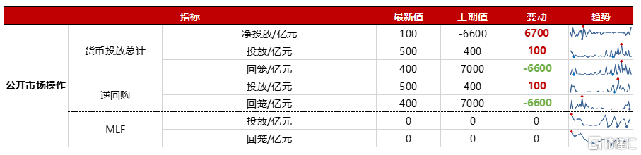 上週貨幣總計淨投放100億元。上週貨幣投放量500億元,貨幣回籠量400億元。