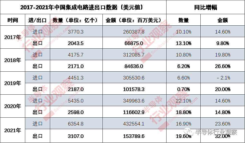 2017-2021年中國集成電路進出口數據(半導體行業觀察整理)