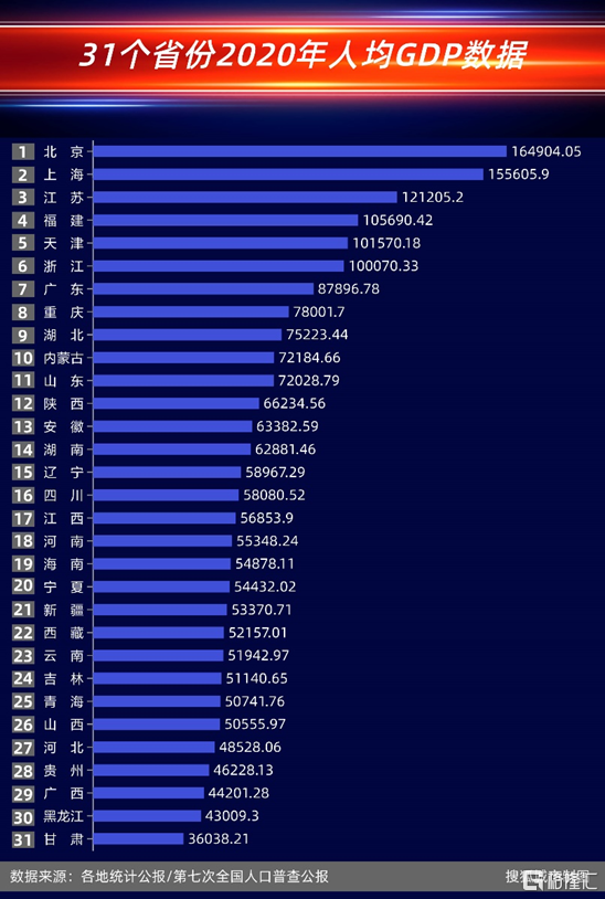 我們看2020年的數據就知道了,下圖是搜狐城市的製圖,人口是根據七普的人口計算的,2020年全國人均GDP202112月份重新覈實爲1013567億元,而七普人口爲141178人,則全國人均GDP7.179萬元,也就是10400美元多點。