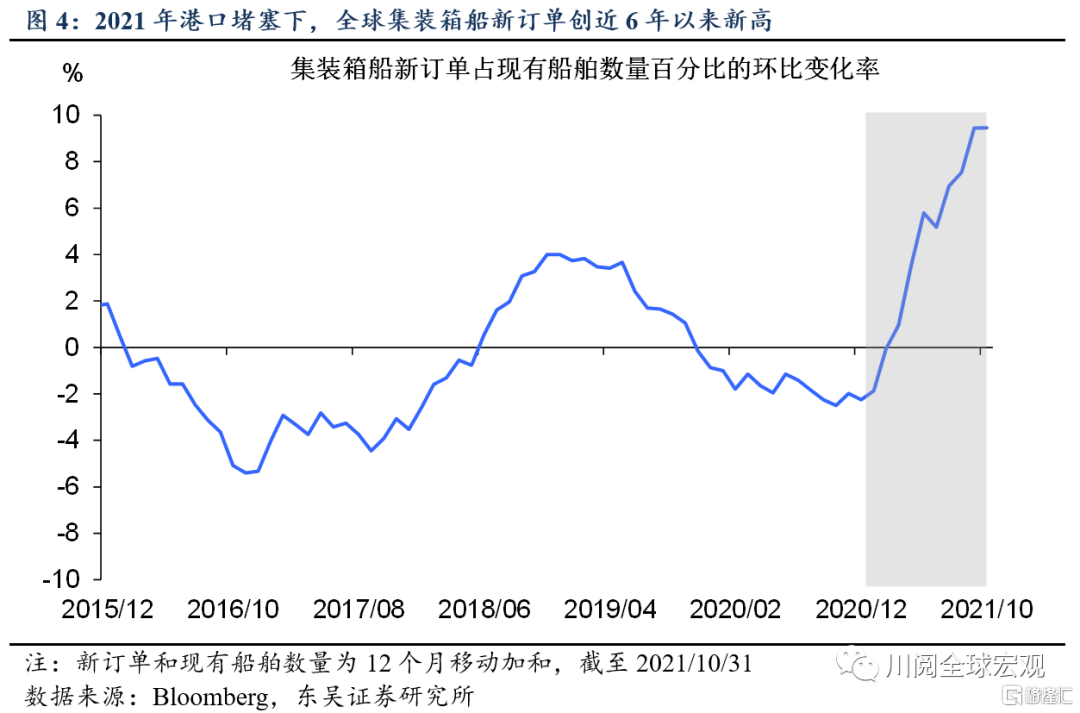 展望2022年,在奧密克戎導致的疫情反覆及各國邊境政策的階段性收緊、我國春節的物流波動下,全球供應鏈中斷可能持續至下半年。不過海運方面的壓力已於2021年見頂,一方面體現在圖2所示的海運價格回落,另一方面,2021年全球新集裝箱船訂單創近6年以來新高(圖4),2022年中,部分新船的投入使用將提升承載量。不過,鑑於港口堵塞可能會持續到2022年中,儘管海運費用呈下降態勢,但可能仍將顯著高於疫情前水平。