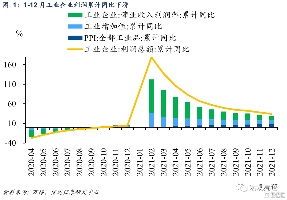 12月工業企業利潤同比增速進一步下滑。1—12月份,全國規模以上工業企業實現利潤總額87092.1億元,比上年增長34.3%,增幅回落3.7個百分點;比2019年增長39.8%,兩年平均增長18.2%,增速回落0.7個百分點。12月份,全國規模以上工業企業利潤同比增長4.8%,增速較上月回落4.2個百分點。