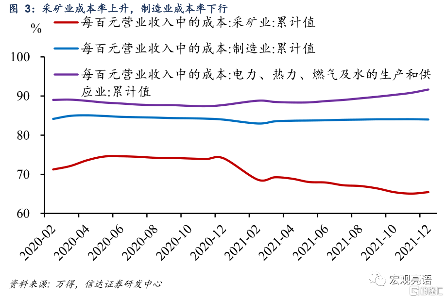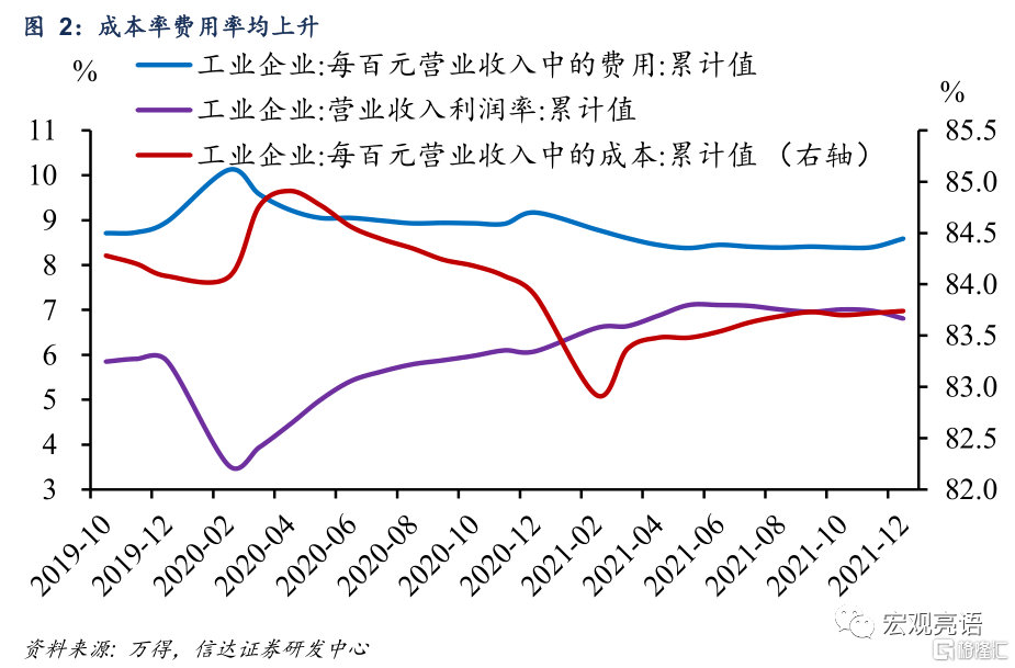 利潤增速下滑,但結構繼續優化。12月份,全國規模以上工業企業利潤同比增長4.8%,增速較上月回落4.2個百分點。根據三因素框架拆解本期工業企業利潤,價格和利潤率均對利潤增速形成拖累。1-12月利潤率爲6.81%,較1-11月回落0.17個百分點,爲2020年2月以來最大單月降幅,對利潤增速影響較大。我們進一步通過成本費用率分析利潤率下降的原因。本期成本率和費用率均出現明顯上升。分行業來看,採礦業、公用事業每百元營業收入中的成本分別上升0.38、0.84,而製造業的每百元成本下降了0.07。大類行業間成本率分化,主要反映了大宗商品價格進入下行通道的背景下,中上遊行業的增長動力減弱,同時中下遊行業的成本壓力顯著緩解,盈利空間正在逐步打開。我們認爲,該趨勢將成爲今年中觀行業的主線之一。再看費用率,本期費用率上升0.19個百分點,上升幅度較大,這意味着繼續推進減稅降費政策的必要性有所增強。但需要注意的是,費用率存在季節性,每年12月都會出現小幅反彈,我們推測其原因與年底企業費用集中計提有關。與歷史情況相比,本次費用率的上升符合季節性規律。