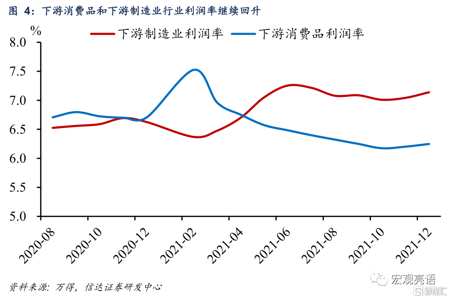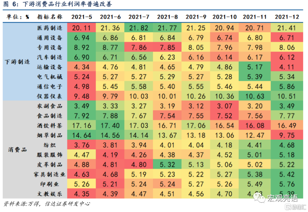 下遊行業利潤將加速好轉。本月下遊製造業與下遊消費品行業利潤佔比分別回升1.47、0.23個百分點,回升幅度顯著高於上月。利潤率方面,下遊製造業提高0.1個百分點至7.14%,下遊消費品提高0.05個百分點至6.25%。具體行業上,農副食品、食品製造、服裝服飾等行業景氣度穩步向好。與此同時,中上遊行業利潤的下降幅度擴大。其核心原因在於保供穩價、運動式減碳糾偏政策的影響下,12月採掘工業和原材料工業PPI價格增速較上月大幅回落。另一方面,PPI生活資料保持穩定有助於中下遊行業提高盈利能力。