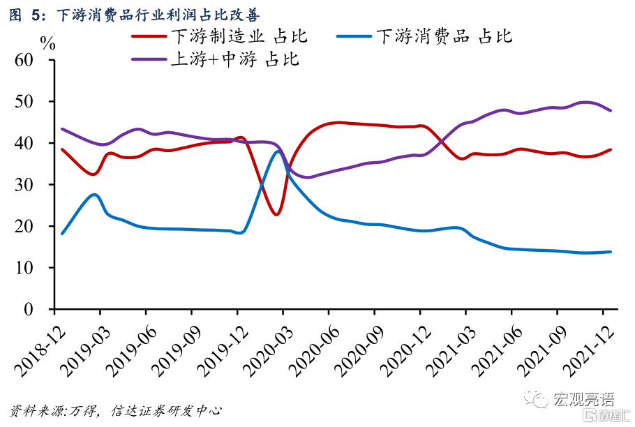 與此同時,中上遊行業利潤的下降幅度擴大。1-12月中下遊行業利潤佔比爲47.8%,較1-11月下降1.7個百分點,連續兩個月回落。煤炭開採和洗選業、黑色金屬冶煉壓延業、有色金屬冶煉壓延業利潤累計同比增速分別放緩9.9、28.8、34.0個百分點。其核心原因在於保供穩價、運動式減碳糾偏政策的影響下,12月份採掘工業和原材料工業PPI價格增速較上月大幅回落。另一方面,PPI生活資料保持穩定有助於中下遊行業提高盈利能力。