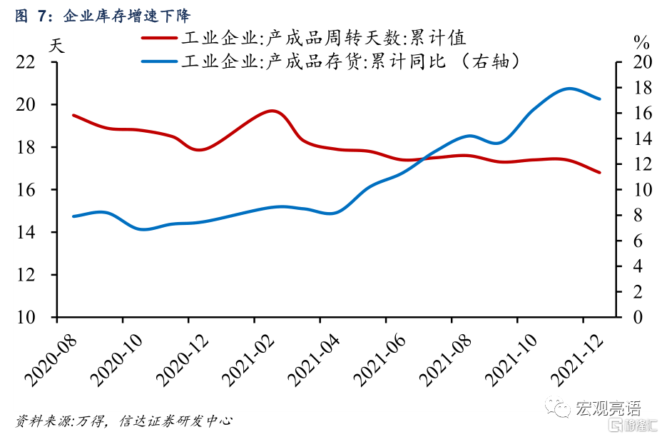 企業可能已經進入“主動去庫存”階段。12月末,規模以上工業企業產成品存貨5.40萬億元,增長17.1%,同比增速較11月末下降0.8個百分點。產成品存貨週轉天數爲16.8天,較上月下降0.6天。本期企業庫存呈現 “產成品存貨下降、產成品週轉天數下降”的組合,再加上工業企業營收和利潤增速正步入下行通道,我們認爲,企業可能已經進入“主動去庫存”階段。另外,從經驗規律看,PPI領先於庫存週期一個季度,近期PPI高位回落也將推動企業轉向去庫存。