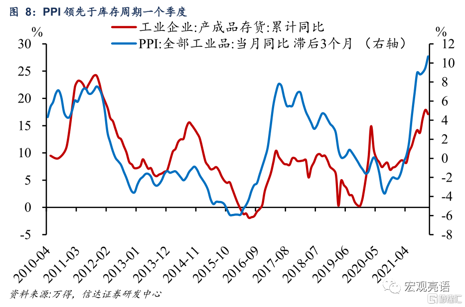 企業可能已經進入“主動去庫存”階段。本期企業庫存呈現 “產成品存貨下降、產成品週轉天數下降”的組合,再加上工業企業營收和利潤增速正步入下行通道,我們認爲,企業可能已經進入“主動去庫存”階段。另外,從經驗規律看,PPI領先於庫存週期一個季度,近期PPI高位回落也將推動企業轉向去庫存。