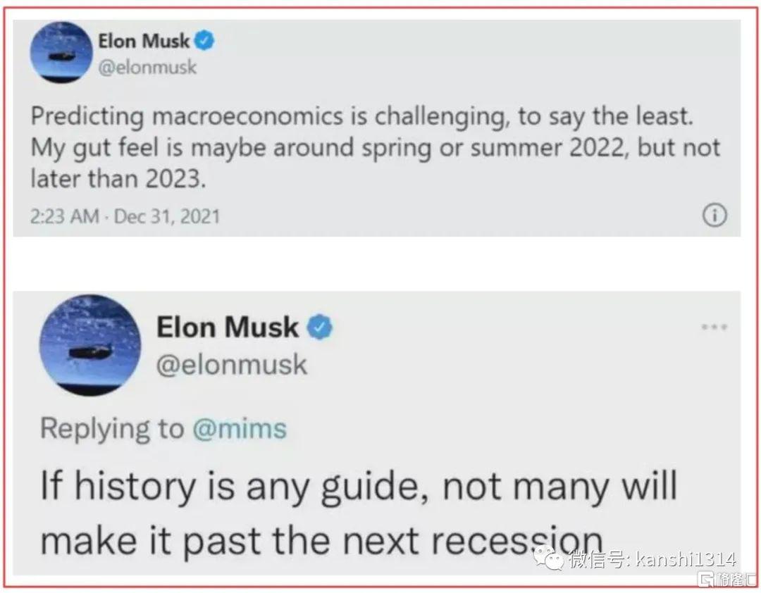 我再舉個例子,比如去年最後一天,埃隆馬斯克就發了條社交媒體,説金融危機很快就要來了,最早於2022年春季或夏季,最遲會在2023年。並聲稱,沒有多少人可以安然度過這一次的經濟衰退。