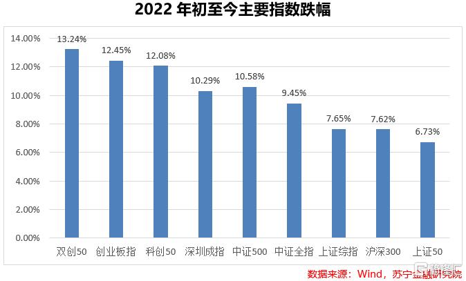 從2022年年初至今,股市第一個月的表現堪稱慘淡,主要指數基本呈單邊下跌狀態,期間短暫的反彈非常之無力。年初至今,中證全指跌超9%。上證綜指下跌超7%。上證50受到大盤權重股的影響,雖有短暫反彈,但也跌超6%。深成指跌近10%。創業板指節前寧德時代業績預告的帶動下雖然有微幅反彈,也跌超12%。代表大盤股的滬深300指數跌超7%。中盤股的中證500跌幅更慘,跌幅近10%。科創50指數及雙創50指數跌幅與創業板相似,跌幅均超12%,其中雙創50指數跌幅最大,年初至今跌超13%。