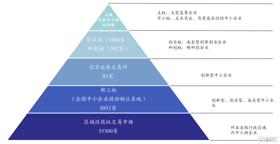 20世紀90年代初,首先在上海證券交易所和深圳證券交易所設立了主板市場。此後,爲了緩解深交所爲籌建創業板停止主板IPO項目而無新股發行的尷尬局面,2004年5月,證監會同意深交所設立中小板。2006年,爲了給高科技中小型企業提供一個類似於納斯達克的交易平臺,證監會決定先將中關村園區內的部分高新技術企業納入“代辦股份轉讓系統”進行試點,也就是“新三板”的雛形。爲了滿足地方中小微企業融資需求,2008年,國內首家區域性股權交易市場——天津股權交易所成立,自此全國各地紛紛開始建立區域性股權交易所。隨着股權分置改革的實施以及公司法、證券法的相繼修訂,資本市場相關制度逐步完善,成立創業板的條件漸漸成熟。經過多年籌備,深交所創業板於2009年10月30日正式啓動上市。之後爲了加快發展多層次資本市場,2013年1月,全國中小企業股份轉讓系統有限責任公司成立,新三板正式掛牌運營,並很快將新三板試點範圍擴大到全國。2019年,爲了逐步實行股票發行註冊制改革和支持信息技術、高端裝備、新材料等領域硬科技企業的發展,上交所成立了科創板。爲了優化深交所板塊結構,形成深交所主板與創業板相互補充、各有側重的發展格局,2021年2月深交所主板與中小板合併。2021年9月,爲了進一步深化新三板改革,打造服務創新型中小企業主陣地,北京證券交易所成立。