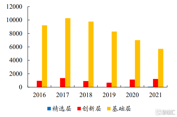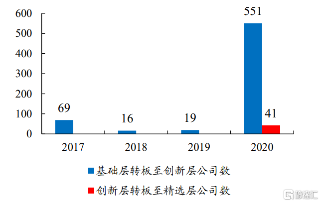 新三板內部分層奠定轉板基礎,創新層實現快速發展。2016年5月,新三板被分爲基礎層和創新層並設置了不同的掛牌條件,2019年10月,新三板進一步推出精選層並引入了新的掛牌條件。新三板的內部分層並設置不同掛牌條件成爲了新三板實施內部轉板的基礎。2020年新三板實行新的分層機制後,滿足相應層級準入條件的公司才能進入該層級進行掛牌交易。公司申請在新三板掛牌並根據自身滿足的掛牌條件,進入基礎層或創新層掛牌;基礎層掛牌公司在滿足創新層掛牌條件之後可以調整進入創新層;連續掛牌滿12個月的創新層公司,在滿足精選層準入條件時可以申請公開發行並進入精選層。新三板新的分層機制和轉板制度的建立,使得創新層的吸引力重新提高,2020年有551家公司從基礎層轉板至創新層,創新層掛牌公司數量也由2019年的667家迅速增加至2020年的1138家。入選精選層的第一批公司有32家,之後又有36家公司從創新層相繼轉入,截至2021年10月29日,共有68家公司進入精選層。