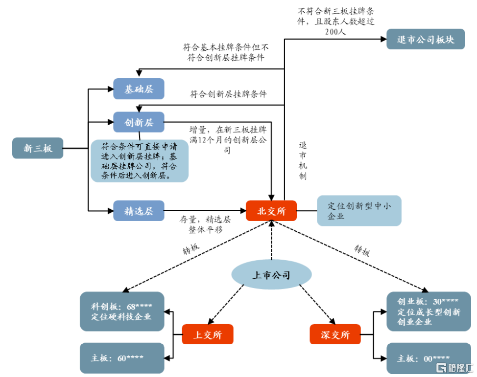 第三步,以創新層爲依託進一步拓展場內外市場的轉板通道。北交所成立後,在新三板掛牌滿一年的創新層公司在滿足北交所上市標準後即可進入北交所上市,這一政策將在較大程度上增加創新層對企業的吸引力。伴隨着創新層對衆多中小公司吸引力的提升,創新層公司數量大幅增加。待北交所以及創新層發展成熟之後,進一步打通創新層(符合科創板或創業板定位的中小公司)向科創板和創業板的轉板上市通道就變得十分必要了。