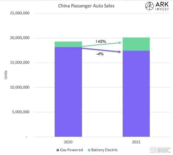 近日,木頭姐還在推特上帶圖發言:中國是消費者對電動車偏好變化的領先指標。在中國,燃油車的銷量實際下降了大約 4%,而電池電動汽車的銷量增長了約 145%。