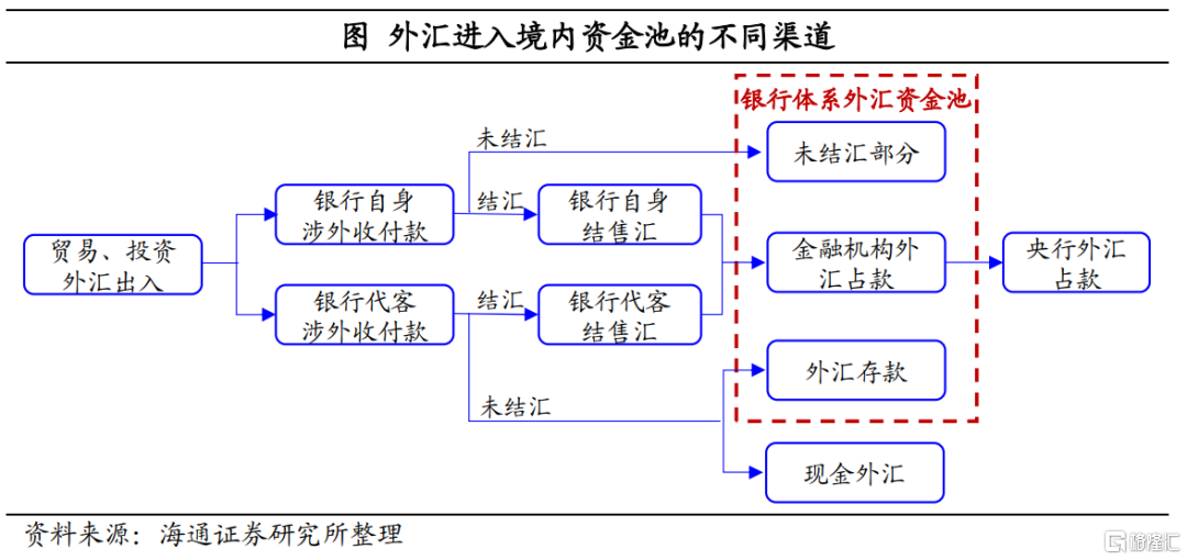在《外匯去哪裏了?——再議人民幣爲何偏強》中,我們曾以100美元的出口收入爲例,描述了外匯是如何在境內流轉,最後形成央行外匯儲備的。我們可以再從銀行體系資金流動的角度,回顧一下外匯進入境內資金池的渠道。