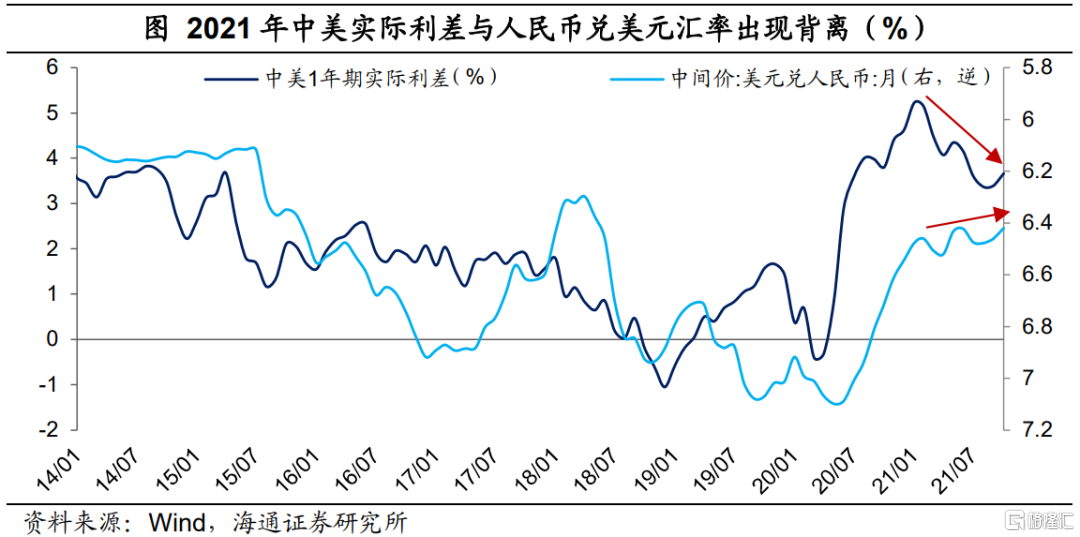 2021年,不論是對比中美實際利差、還是美元指數,人民幣匯率都與以往這些主導因素出現了一定的背離,而逆勢走強。我們傾向於認爲,去年人民幣的持續升值中,結匯需求旺盛是主導因素,境內美元流動性也起到了推動作用,使得人民幣匯率在一定程度上偏離了基本面因素。
