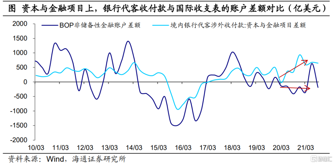 比如,同是資本與金融項目,對比銀行代客收付款表與國際收支表的賬戶差額,多數時候都存在一定偏差,甚至在2020年以來出現了方向上的背離(涉外代客收付款項目順差、BOP金融賬戶逆差)。因而,銀行自身涉外交易產生的影響或並不容忽視。