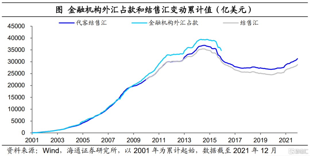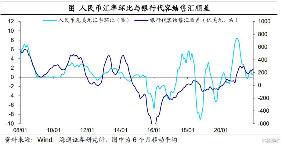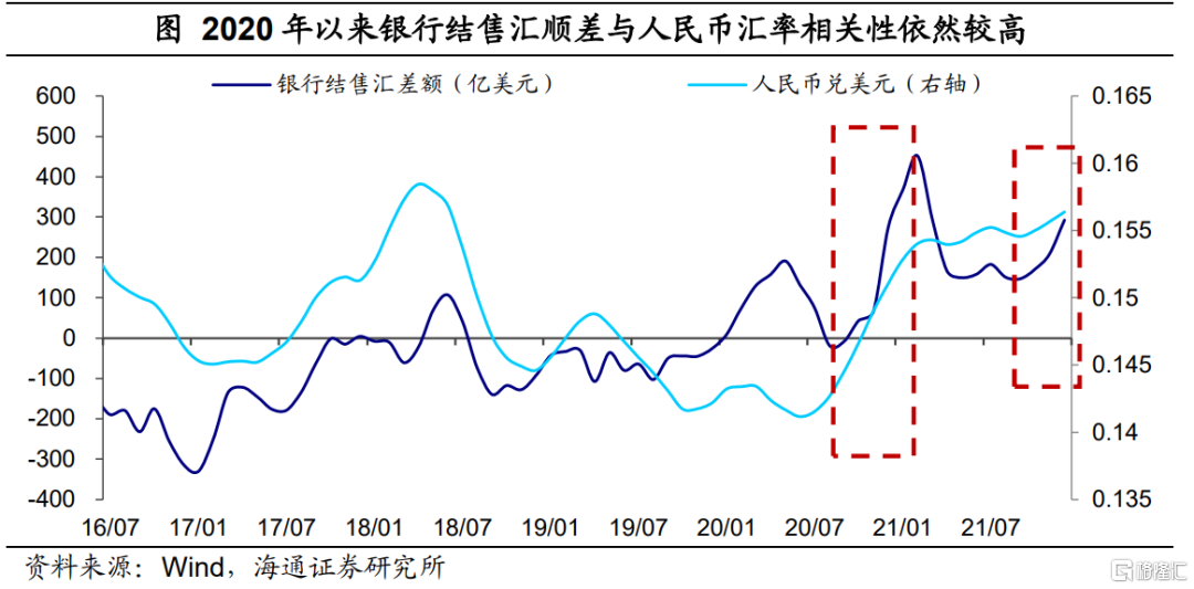 從近兩年的情況看,銀行結售匯順差與人民幣兌美元匯率持續保持較高的一致性,2020Q42021Q4人民幣匯率的加速上行,都伴隨着結售匯順差的相對擴大。