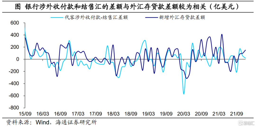 除結售匯統計外,還需要考慮未結匯資金規模的變化。由於銀行自身未結匯部分不易拆分,我們重點考慮佔比更大的企業居民主體未結匯資金,其主要體現爲銀行外匯存貸款的變化。從結果看,外匯存貸款差額的增量與結售匯順差數據兩者之和,多數時候也與銀行涉外代客收付款順差呈現同向的變動。