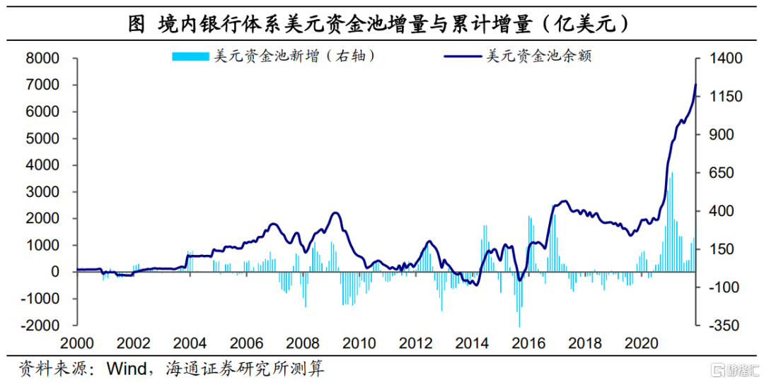 選用“金融機構外匯佔款+新增外匯存貸款差額-央行外匯佔款”,或可以較好模擬境內銀行體系美元資金池的變化情況。從測算結果看,從2020年開始,境內美元資金池中的“蓄水量”開始迅速增長,到2021年底總規模已超7000億美元,接近2020年初的4倍。也就是美元資金大量累積在銀行體系內,成爲近兩年外匯市場不容忽視的因素。