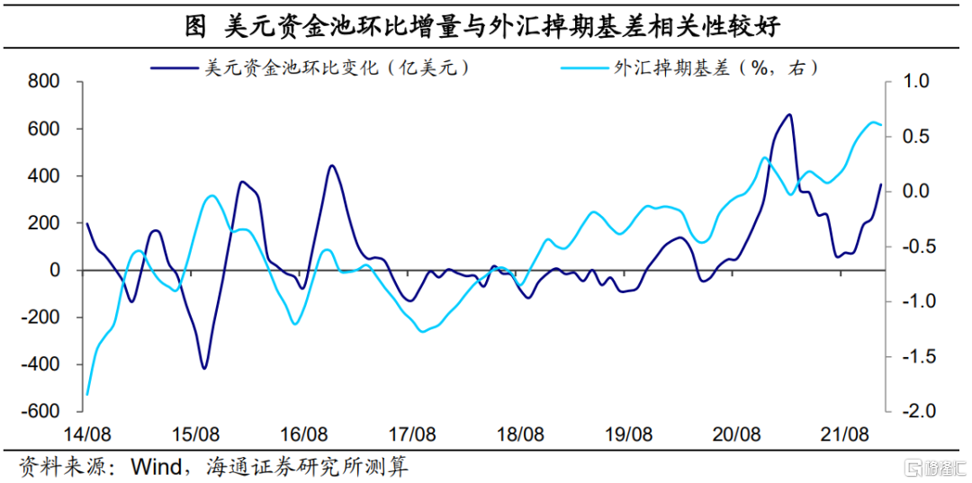 由於央行外匯儲備的市場化程度並不高,而居民手上的現金佔比較低,因而想要觀察境內美元流動性,我們主要關注商業銀行體系中的外匯資金池變化。