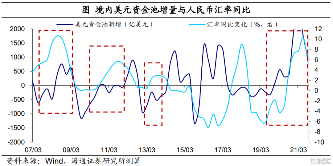 而在這個過程中,境內美元流動性充裕則意味着人民幣需求進一步積累,使得人民幣易升難貶。比如對於企業主體,截至2021年境內外幣存款已接近1萬億美元,一旦人民幣匯率有所貶值,企業便可以趁機結匯,從而重新推升人民幣匯率。回顧歷史,在境內美元資金淨流入邊際回暖階段,人民幣匯率也往往出現走強。