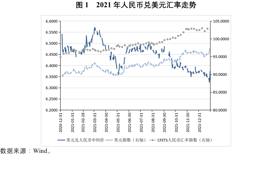 2021年人民幣匯率呈現強勢升值態勢。人民幣兌美元匯率中間價由6.5249上升至6.3757,升值了2.3%;人民幣兌CFETS貨幣籃子指數由94.84上升爲102.47,升值了8%。(圖1)。