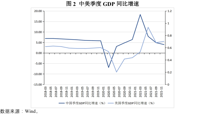 2021年下半年,在美元指數上升的背景下,人民幣兌美元匯率依然走強。筆者認爲,這一現象背後有三方面因素推動:一是中國出口增速持續保持強勁,帶動貨物貿易順差創出歷史新高;二是新冠疫情後中國經濟復甦早於其他國家,且長期利率顯著高於主要發達經濟體,導致中國對短期資本流動的吸引力較強;三是中國外匯儲備規模穩中有升,增強了國內外投資者對人民幣匯率的信心。展望2022年,人民幣匯率強勢升值格局還會延續嗎?筆者認爲,考慮到目前人民幣兌CFETS貨幣籃子指數已經處於自2015年12月以來的新高,預計未來人民幣有效匯率繼續升值的空間較爲有限。在美聯儲持續收緊貨幣政策的外部環境下,中美兩國貨幣政策分化將顯著加大,這可能導致人民幣兌美元匯率由升轉貶。在經濟增長方面,中美經濟增速的差距已經顯著縮小。2021年美國GDP增速爲5.7%,中國GDP增速爲8.1%。2022年1月,IMF將美國2022年GDP增速從5.2%下調至4%,這主要是考慮到美國國會通過“重建美好未來”法案一攬子財政措施的可能性下降,當局更早退出非常規寬鬆貨幣政策,以及經濟面臨持續的供給擾動。同時,考慮到中國房地產部門持續收縮,且私人消費的復甦弱於預期,IMF將中國2022年的GDP增速從5.6%下調至4.8%。從季度GDP增速來看,2021年美國季度GDP同比增速分別爲0.5%、12.2%、4.9%和5.5%;中國季度GDP同比增速分別爲18.3%、7.9%、4.9%和4.0%。2021年二季度與四季度,美國經濟增速已經超過中國(圖2)。