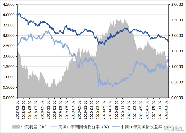 在通脹方面,中美通脹走勢分化,美國通脹持續走高,中國通脹整體可控。2021年,美國通膨持續走高。2021年1月至2021年12月,美國CPI由1.4%快速上升至7%,這是美國自1982年7月以來的最高通脹水平。同期內,核心CPI當月同比增速從1.4%上升至5.5%。美國通貨膨脹率快速攀升的原因有三:一是由於美國的宏觀政策刺激偏向於需求面,導致美國國內需求面的復甦顯著快於供給面;二是全球疫情大爆發導致大宗商品供應與遠程運輸能力顯著下降,推升了全球大宗商品價格;三是在美國經濟增速已經顯著復甦的前提下,美國政府的財政貨幣政策化明顯滯後。隨着美國通貨膨脹率迭創新高,美聯儲不得不開始貨幣政策正常化。2021年,中國通脹整體可控,CPI增速仍處於低位。2021年1月至2021年12月,中國CPI同比增速從-0.3%上升至1.5%。2021年,中國PPI走勢觸頂回落。2021年1月至2021年12月,中國PPI同比增速從0.3%飆升至10.3%。2021年10月,中國CPI與PPI同比增速分別上漲至1.5%與13.5%,兩者之間的缺口達到歷史性峯值。導致中國PPI同比增速飆升的主要原因是全球大宗商品價格的上漲。目前,不少品種的大宗商品價格已經創下歷史性新高。全球大宗商品價格上漲給大宗商品進口國造成了顯著的輸入性通貨膨脹壓力。2021年,國內大宗商品價格總指數、能源類價格指數、鋼鐵類價格指數與農產品價格指數都創出歷史性新高。2021年10月中國進口價格指數同比增速高達17.0%。筆者認爲,2022年大宗商品價格再創新高的概率,會顯著低於高位回落的概率。尤其是那些金融資本深度炒作的大宗商品品種,在2022年的價格面臨較高的波動性。爲此,未來一段時間的物價走勢將會呈現出中國CPI同比增速溫和回升、PPI同比增速回落格局。在貨幣政策方面,中美兩國貨幣政策分化加大,美聯儲將會加快退出量化寬鬆政策,中國央行將會實施較爲寬鬆的貨幣政策。新冠疫情爆發後,美國政府實施了史無前例、極其寬鬆的財政貨幣政策。財政政策方面,2020年,聯邦政府財政赤字佔GDP比率達到14.9%,顯著高於次貸危機爆發後2009年的9.8%。2020年,聯邦政府債務佔GDP比率上升了24.3個百分點,達到132.5%。貨幣政策方面,除再次實行零利率外,美聯儲還實施了規模巨大的量化寬鬆政策。在不到兩年時間內,美聯儲資產負債表的總規模翻了一倍以上,從4萬億美元逼近9萬億美元。在寬鬆政策刺激下,美國通貨膨脹形勢顯著惡化。儘管通脹率在2021年上半年就開始顯著上升,但美聯儲認爲這僅是暫時性擾動,隨着生產的復甦以及供給需求缺口的消失,通脹率自然會下行。然而,通脹率在2021年下半年的持續快速上升所引發的各方面壓力,還是導致美聯儲不得不在2021年11月初做出政策修正,宣佈開始縮減量化寬鬆規模。從2021年11月起,美聯儲將在每個月縮減購債150億美元,這意味着美聯儲將在2022年6月末停止量化寬鬆。2022年1月27日,美聯儲再度宣佈將會加快縮減購債速度,在2022年3月完成Taper,基本明確開啓加息。2021年中國經濟增速前高後低,基於2021年上、下半年經濟形勢變化,中國央行實施了較爲寬鬆的貨幣政策。2022年7月和12月,中國央行實施兩次全面降準各0.5個百分點。考慮到中國當前整體通脹形勢可控,物價不成其爲貨幣政策加快正常化的理由。總體來看,2022年,中國貨幣政策仍將堅持“以我爲主”,推出有利於經濟穩定的貨幣政策,中國貨幣政策可能會呈現出穩中有鬆態勢。在中美利差方面,中美利差將會顯著收窄。美聯儲退出量化寬鬆政策可能導致美債收益率上升、美元指數仍可能高位盤整。在新冠疫情爆發後,10年期美國國債收益率一度下降至0.5%左右的歷史性低點。截至2021年12月下旬,該指標已經反彈至1.5%。在2013年美聯儲上一次Taper期間,10年期美國國債收益率曾經由1.5%左右反彈至3%以上,之後再度回落。隨着美聯儲在2015年至2018年不斷加息,10年期美國國債收益率再度反彈至3.0%以上。筆者認爲,在2022年,美聯儲退出量化寬鬆將使10年期美國國債收益率重返2.0%以上,甚至可能上探至2.4-2.5%。這意味着美國債券市場將面臨一定的下行壓力。新冠疫情爆發後,美元指數先是摸高至103,隨後下跌至90附近,之後在2021年下半年反彈至目前的96-97左右。筆者認爲,2022年,考慮到美聯儲的貨幣政策正常化,美元指數有望在94-102的區間內高位盤整。與美債收益率上行形成鮮明對比的是,10年期中國國債收益率在2021年呈現波動中下降的趨勢。2021年1月4日至2021年12月31日,10年期中國國債收益率從3.1713%下降至2.8352%,下降了33個基點。同期中美10年期國債收益率利差從2.2413%收窄至1.3152% (圖3)。伴隨着中國央行在2021年12月以來的加息節奏,10年期中國國債收益率在2022年1月25日更是一度降至2.6938%。中美利差縮小會影響到短期跨境資本流動,進而影響人民幣匯率交易需求,從而影響到人民幣匯率走勢。短期來看,中國會面臨一定的資本外流的壓力。