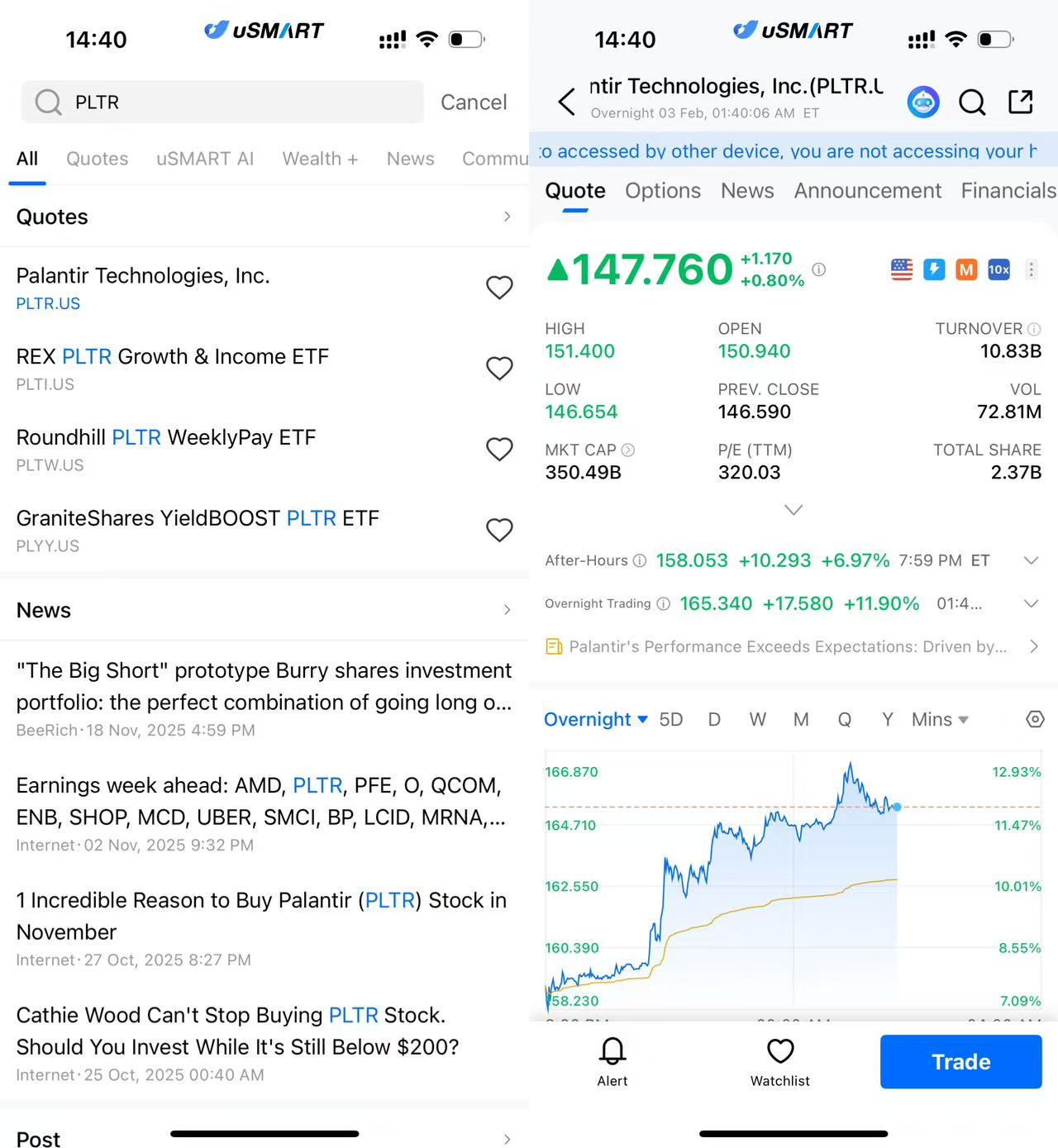 After logging into the uSMART HK app, click the “Search” button in the top-right corner of the page, enter the ticker code (PLTR.US), and navigate to the details page to view transaction details and historical trends. Click the “Trade” button in the bottom-right corner, select the trade type, and submit your order after filling in the transaction conditions.