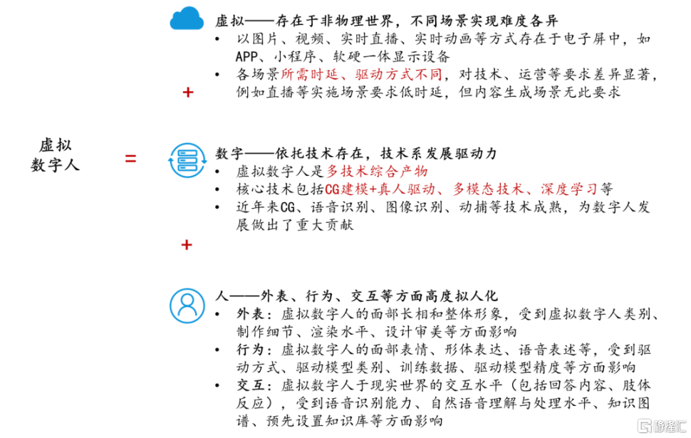 虛擬人爲多方面高度擬人化的多技術綜合產物。根據頭豹研究院的定義,虛擬人是指通過計算機圖形學、圖形渲染、動作捕捉、深度學習、語音合成等技術,打造出的具備數字化外形的虛擬人物。其存在於非物理世界中,依託顯示設備呈現形象。根據《2020虛擬數字人白皮書》,與機器人不同的是,虛擬人擁有人的外觀(具有特定的性別、性格等人物特徵)、人的行爲(具有用語言、面部表情和肢體動作表達的能力)和人的思想(具有識別外界環境、並能與人交流互動的能力)。