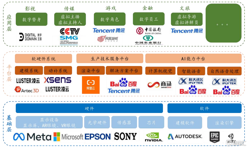 虛擬人的產業鏈從上至下可分成基礎層、平臺層和應用層